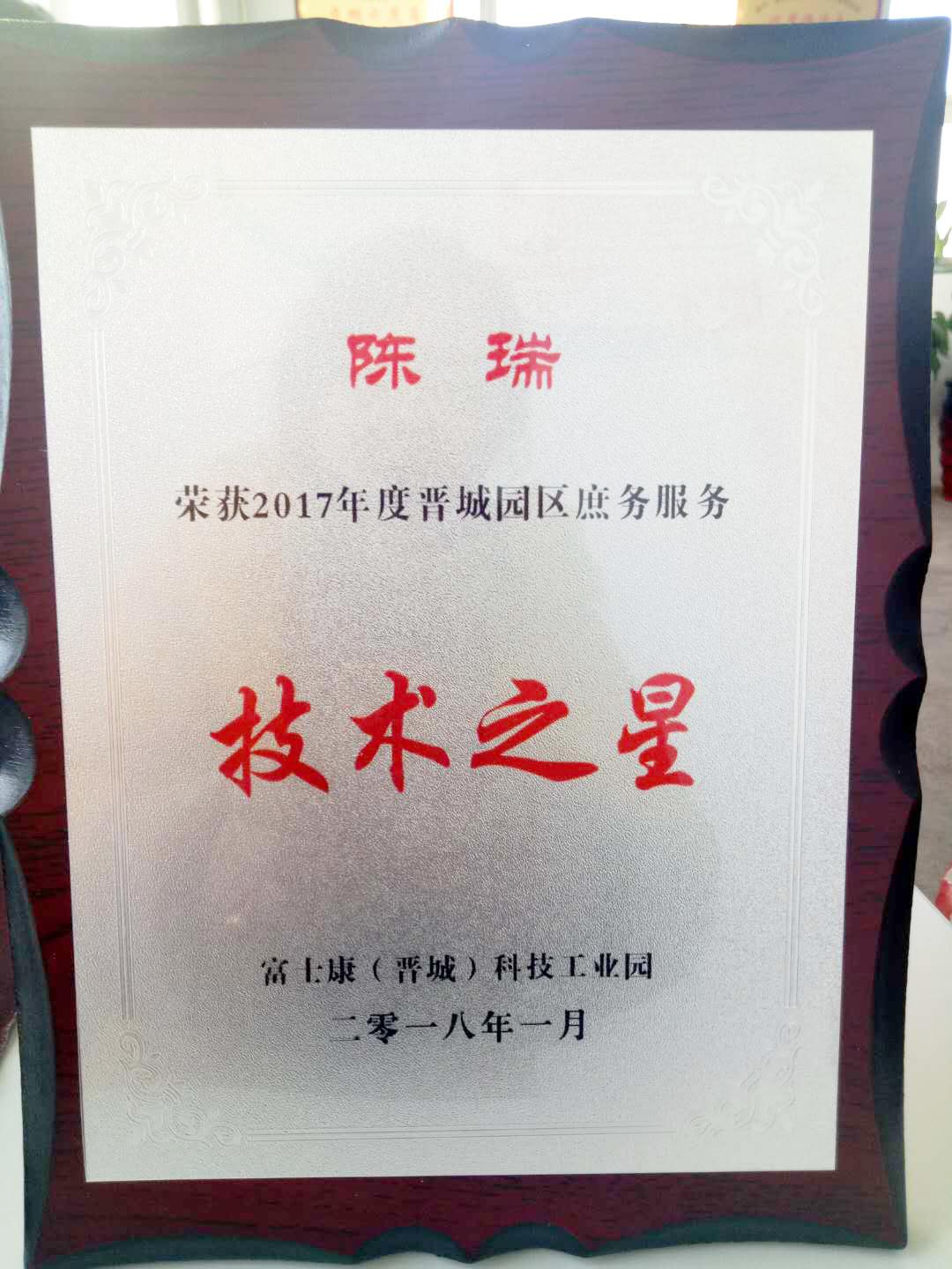 近日,在富士康(晉城)科技工業(yè)園舉辦的2017年度晉城園區(qū)庶務服務年終評比中,我公司員工陳瑞榮獲“技術之星“的稱號,這份榮譽是陳瑞總結日常工作所得經驗再加上自身的刻苦鉆研,勤勞肯干的精神取得的。
