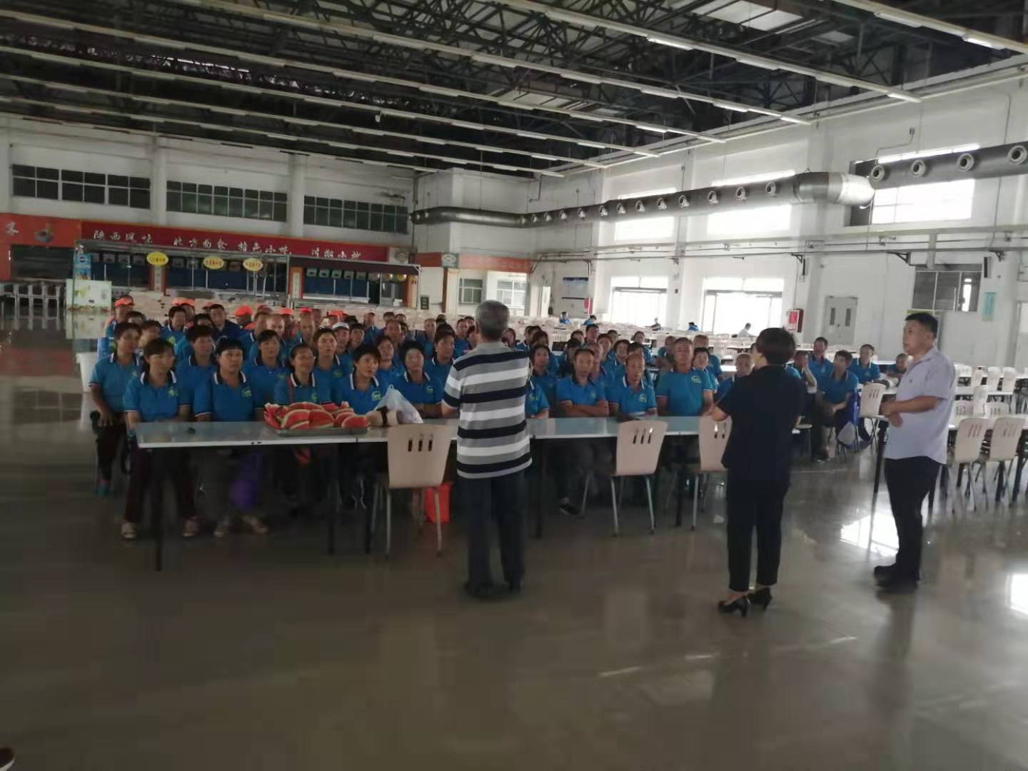 在富士康餐廳二樓,利用工作人員切西瓜的間隙,公司總經(jīng)理程晉軍作了簡(jiǎn)短的講話。他說(shuō),前一段時(shí)間,公司召開(kāi)了“安康杯”勞動(dòng)競(jìng)賽動(dòng)員大會(huì),大家要提高安全意識(shí),始終把安全工作放在心上。他囑托大家在夏季工作中一定要注意防暑,感謝大家在酷暑下依舊兢兢業(yè)業(yè)奮斗在各自的工作崗位上。工會(huì)主席崔偉也作了簡(jiǎn)要發(fā)言,他說(shuō),今年是潔霸公司成立二十周年,希望大家在工作中繼續(xù)發(fā)揚(yáng)潔霸精神,積極樹(shù)立潔霸形象,為公司爭(zhēng)光。