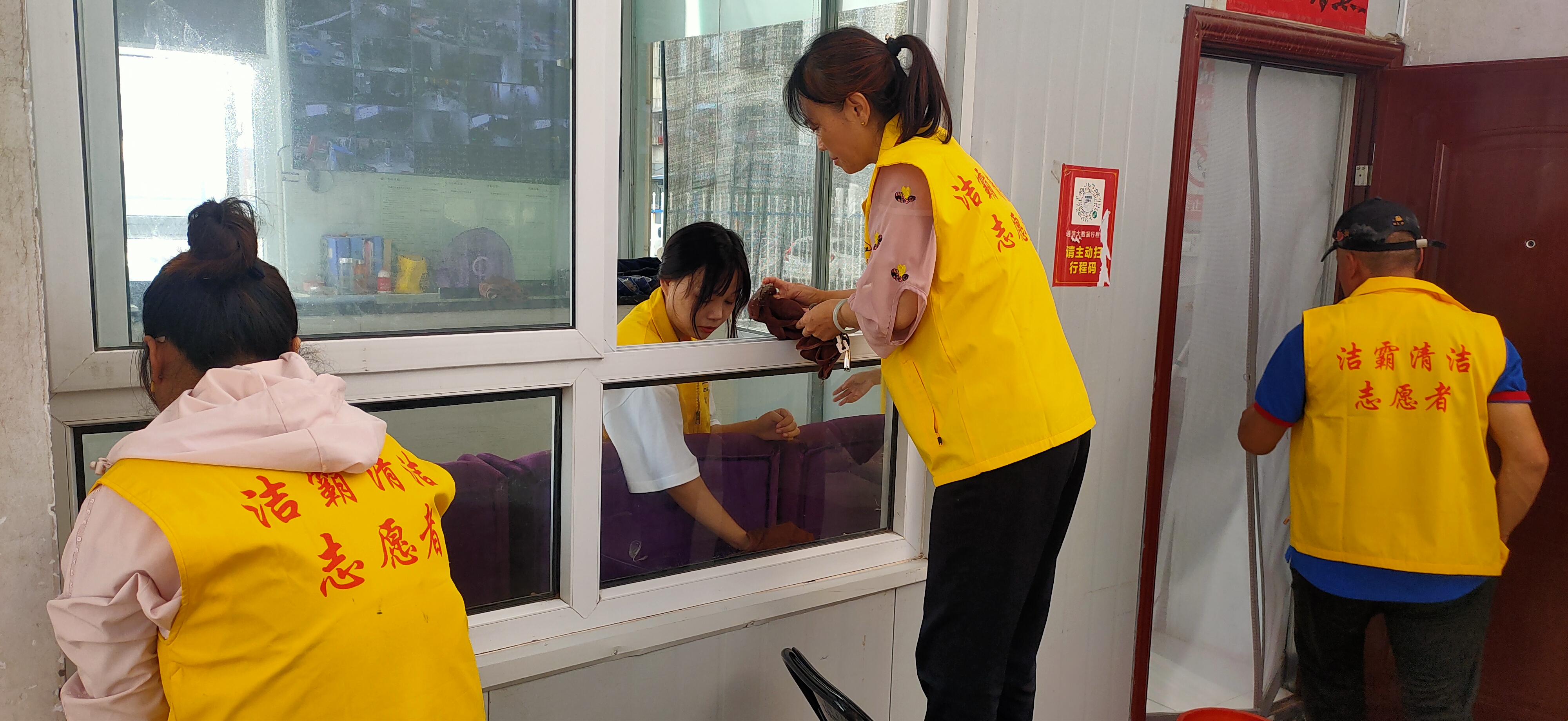 活動現(xiàn)場,志愿者身穿黃色馬甲,自帶玻璃擦、毛巾、笤帚、簸箕等清潔工具,對小區(qū)物業(yè)服務處及小區(qū)環(huán)境進行清潔打掃。他們有的清掃小區(qū)天臺上的垃圾;有的清理樓道門及公共設施上的牛皮癬;有的擦拭門衛(wèi)的玻璃;有的清洗紗窗;有的清洗物業(yè)服務處的玻璃幕墻……志愿者個個干勁十足,不怕臟、不怕累,經(jīng)過一個多小時的團結(jié)協(xié)作,小區(qū)環(huán)境煥然一新。