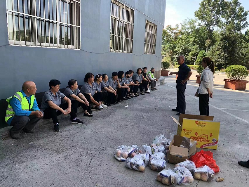 工會主席崔偉一行先后走訪萬達廣場、山西科技學(xué)院、晉城市金鳳凰廣場、鳳西廣場、白馬寺、青蓮寺、陽城北留潔霸洗業(yè)等地,對戶外高溫下作業(yè)的高空清洗員工、物業(yè)保潔員工、環(huán)衛(wèi)員工、園林綠化員工及洗衣廠員工等一線勞動者進行慰問。崔主席充分肯定了高溫下堅持奮戰(zhàn)在一線員工的敬業(yè)精神,感謝他們?yōu)闈嵃浴皯?zhàn)高溫、斗酷暑”付出的辛勤勞動,并將面包、桃子、白糖等慰問品送到員工手中,讓高溫下堅守在一線的員工感受到來自潔霸大家庭的關(guān)愛。