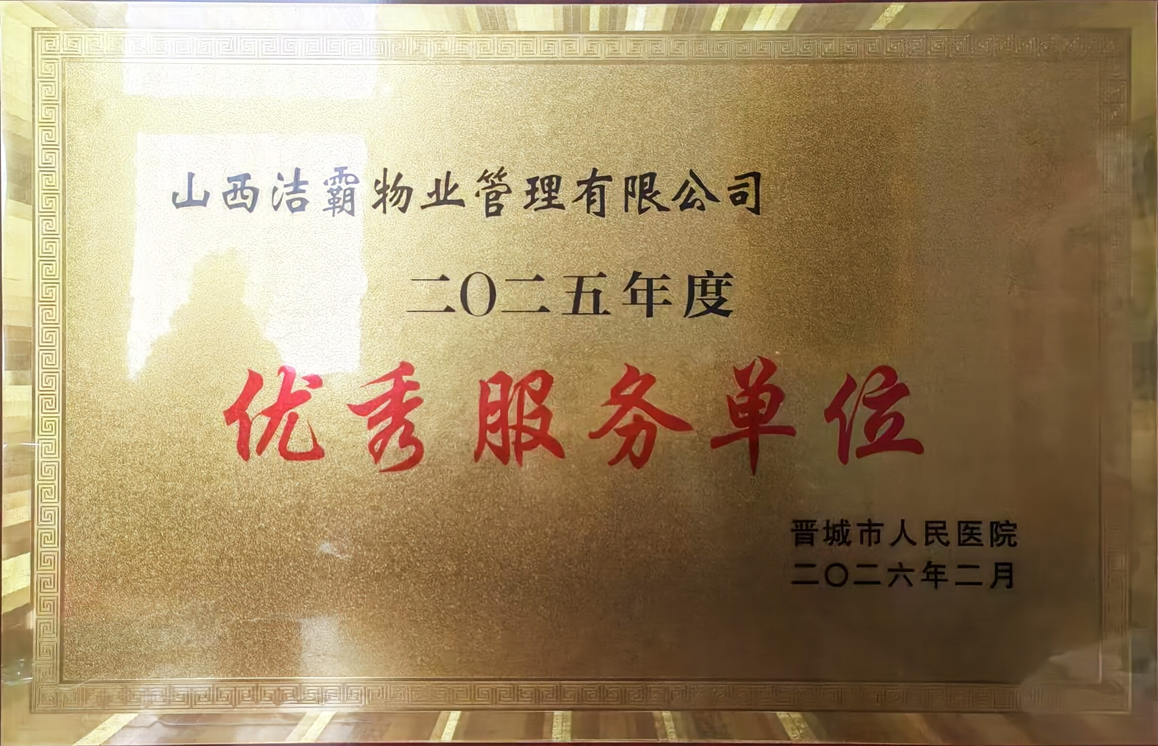 2月8日下午,晉城市人民醫(yī)院隆重召開第三屆職工代表大會(huì)第五次會(huì)議暨2026年工作會(huì)議,全面總結(jié)2025年發(fā)展成果,系統(tǒng)部署2026年重點(diǎn)任務(wù),并對(duì)為醫(yī)院發(fā)展做出突出貢獻(xiàn)的先進(jìn)集體與個(gè)人進(jìn)行表彰。山西潔霸物業(yè)管理有限公司憑借優(yōu)質(zhì)服務(wù)表現(xiàn),榮獲晉城市人民醫(yī)院2025年度“優(yōu)秀服務(wù)單位”稱號(hào)。